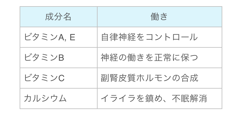 ビタミンB群、ビタミンC、ビタミンA.、カリウムEなど